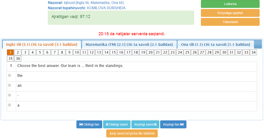 Imtihon natijalari tizimda doim saqlanadi. Ushbu natijalarni xohlagan paytda ko'rish va tahlil qilish mumkin.